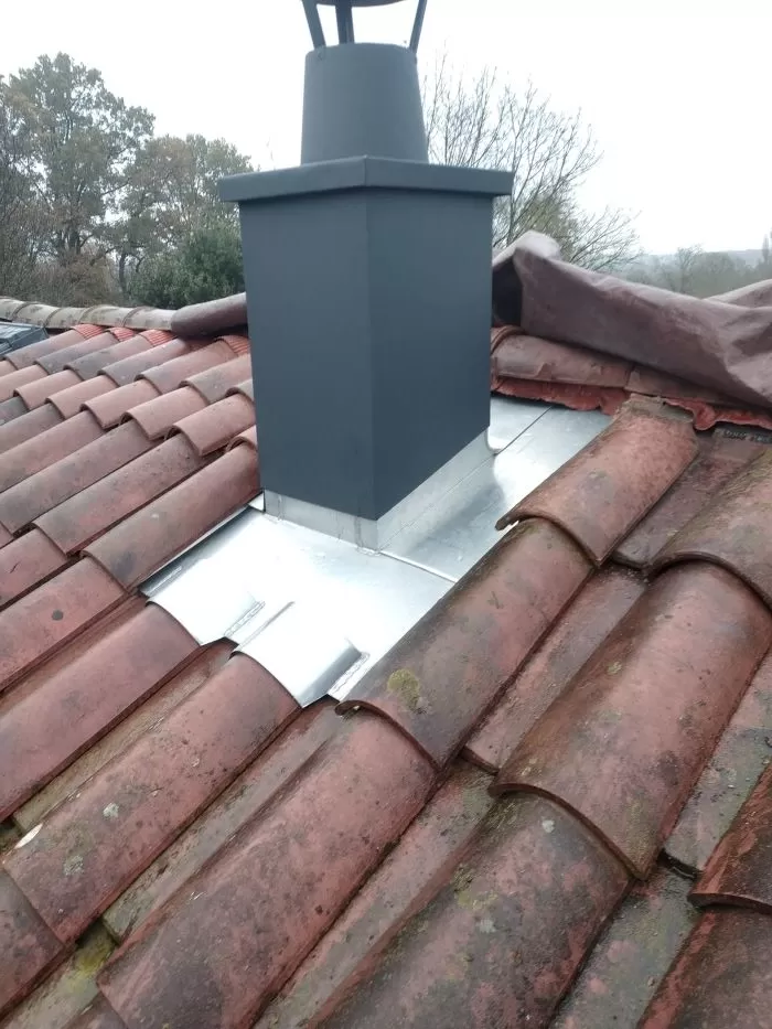 FR zinguerie a réalisé un abergement de cheminée en zinc suivie d'un habillage de cheminée en aluminium texturé ral 7016